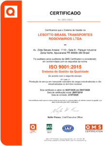 A Lesotto Transportadora tem o orgulho de ser certificada pela ISO 9001, o que reflete nosso compromisso em oferecer serviços de transporte de alta qualidade e atender às expectativas dos nossos clientes. Nossa certificação ISO 9001 é um testemunho da nossa busca pela excelência operacional, melhoria contínua e foco na satisfação do cliente. Conte conosco para um serviço confiável e eficiente, respaldado por padrões internacionais de qualidade.